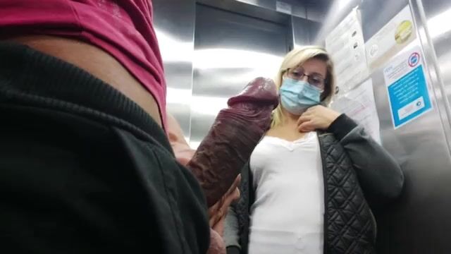 A stranger was wanking his dick in the lift. Suddenly, a blonde milf came and saw him wanking. The milf got horny. She gave him a handjob and made him cum.