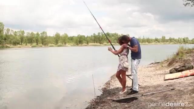 A guy was fishing on the edge of a pond. His GF came and seduced him. The BF removed his BF's clothes and fucked her passionately on the ground.