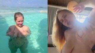 A German girl visits Miami for vacation, and she swims in the swimming pool with a sexy bikini outfit and exposes her big tits in her bra. After getting a chill bath, she takes her boyfriend to the hotel bedroom. And strips off her dress, then shows her milky tits while she rides his dick on top of him, grinding her ass until he creampies into her vagina.