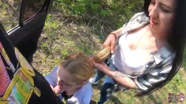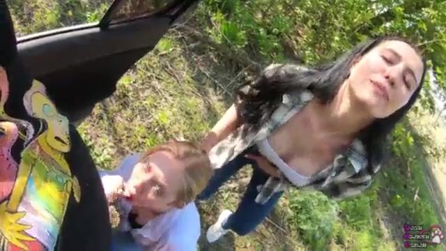 Two lost girls ask a guy for help, but the guy asks for a blowjob in return. The girls accept it. One of the girls gives him a blowjob and takes cum on his face.