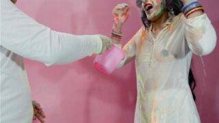 An Indian jija poured colors and water on his sali. The sali was a slut. She seduced her jija. The jija removed his sali's clothes and fucked her pussy.