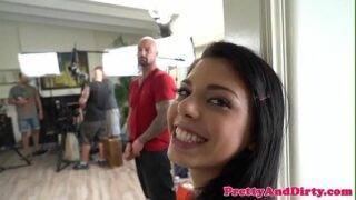 A pornstar wanted to show the porn shoot. She showed how she sucked multiple cocks during the shoot. She gave the guys a blowjob and ate their cum.