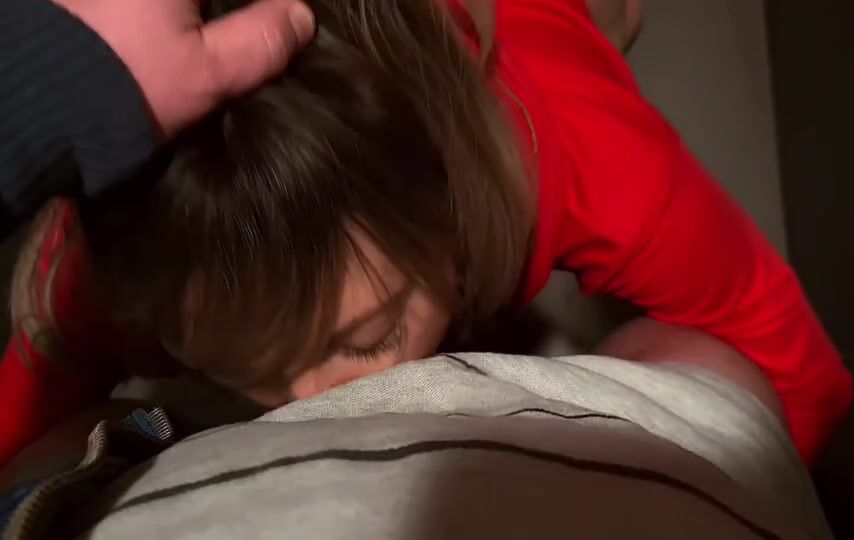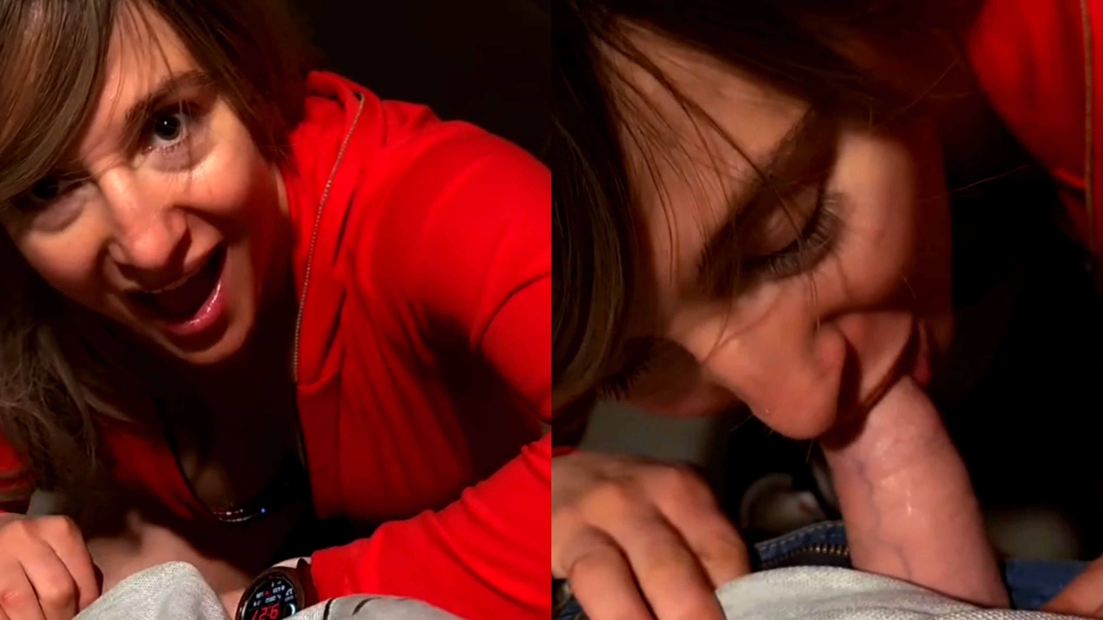 Red dress woman gives hot blowjob to her stepson
