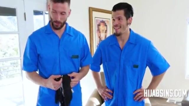 Two men had come to a house for a job. They saw a lady in the hijab. The lady was a slut. She seduced both the guys. Later, she fucked in a threesome.