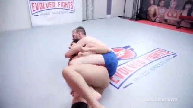 In a cross-gender match, a busty wrestler got horny. She seduced her opponent in the ring. The opponent sucked her big boobs and fucked her hard.